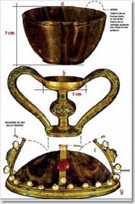 oreficeria, con due manici, di epoca medievale. E’ una coppa di agata cornalina orientale di 9,5 cm di diametro e 7 cm di altezza, datata fra i secoli II e I a.C. proveniente da Antiochia (Siria) o Alessandria (Egitto). Quindi abbiamo: la coppa superiore (Santo Graal), la base (una coppa ovale capovolta) e il nodo d’oro come elemento di unione, con i manici e un ornamento sulla montatura, decorata con pietre e perle.