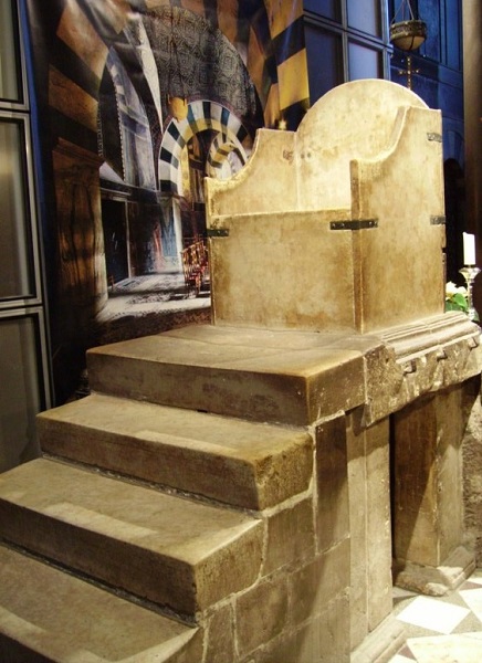 trono. Por lo tanto era un espacio destinado al emperador y a los altos dignitarios de la corte. El trono, como aun puede verse, y como el de Salomón, está sobre una plataforma con seis escalones y en su interior tiene algunos compartimentos donde se conservaban reliquias. De esta manera todo juramento prestado sobre éste tenía un doble valor: compromiso sagrado y secular. La fórmula para los juramentos era: “Puedan Dios y los santos a los que estas reliquias pertenecen, juzgarme”.
