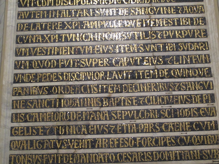 En este panel en mosaico se detallan, con letras doradas sobre fondo negro, las reliquias custodiadas en la basílica y en la cercana capilla de San Lorenzo, más conocida como ‘Sancta Santorum’, a la que se accede subienda la ‘Scala Santa’. Este panel se encontraba anteriormente detrás del altar mayor de la basílica constantiniana, en el pórtico hexagonal, donde lo hizo colocar el papa León X (1513-1521).