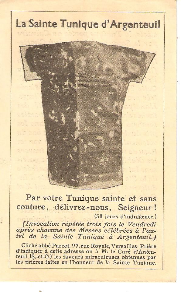 Cartello pubblicitario ad uso dei pellegrini realizzato in occasione dell’0stensione del 1934. La didascalia recita: “Attraverso la Vostra santa Tunica senza cuciture, liberaci Signore! (50 giorni d’indulgenze) (Invocazione ripetuta tre volte il venerdì dopo ciascuna delle Messe celebrate all’altare della Santa Tunica a Argenteuil).” Inoltre si fornisce un’indirizzo dove segnalare i favori miracolosi ottenuti grazie alle preghiere fatte in onore della Santa Tunica