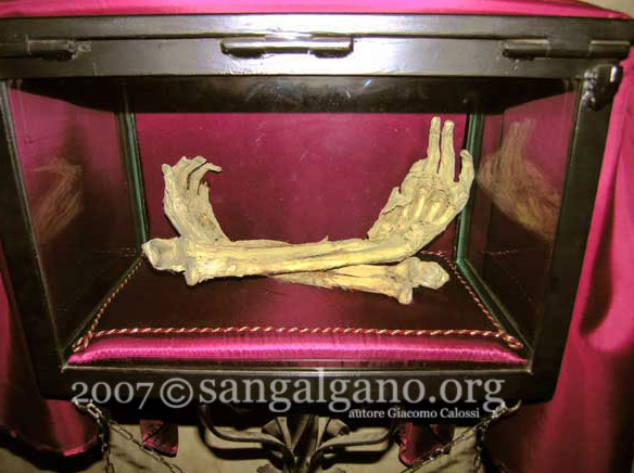 spada nella rocciaEn cuanto al cuerpo de San Galgano, su presunta cabeza está conservada en la iglesia de San Miguel en Chiusdino, en un relicario moderno. El anterior relicario era del siglo XIV. Del cuerpo se sabe muy poco. En 1924 se sacó de un hueco cerca de la roca una cajita de plomo con la inscripción ‘Huesos de San Galgano’ pero en realidad se trataba de trozos de madera fechables alrededor del 1800. ¿Serían tal vez fragmentos del ataúd del santo?