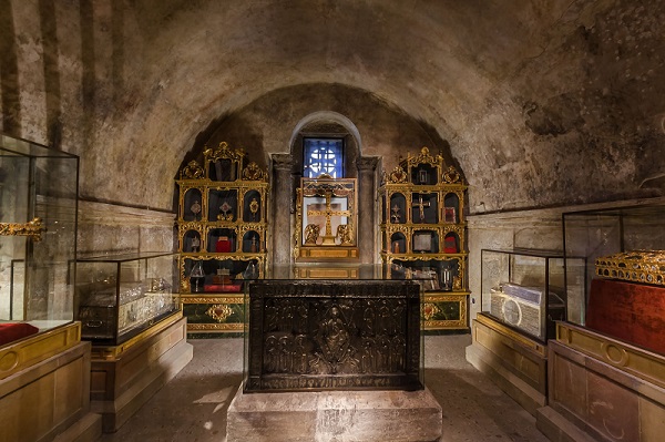 Secondo una tradizione dell’XI secolo, le reliquie presenti a Toledo furono radunate in un’arca di legno, compreso il santo sudario, e portate nelle Asturie dove vennero nascoste in un eremitaggio sul Monsacro, una montagna a dieci chilometri da Oviedo, la capitale. Nell’840 il re Alfonso II fece costruire all’interno del suo palazzo la ‘Cámara Santa’, una cappella che da allora accoglie l’arca e tutte le reliquie che conteneva. Oggi è incorporata alla cattedrale di San Salvador, del XIV secolo, e vi si conservano anche altri importanti tesori.