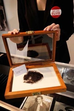 Otros tesoros de la colección de Mabe son trocitos de cabellos de Elvis obtenidos de su barbero de Los Ángeles o una vial con su sudor.