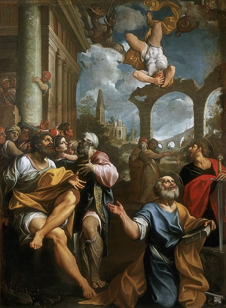 Vedendo questo straordinario spettacolo, Pietro gridò al Signore Gesù Cristo: ‘Se tu permetterai che quest’uomo porti a compimento quanto ha iniziato, tutti coloro che hanno creduto in te ne resteranno scandalizzati e più non si crederà ai segni e prodigi che tu, per mezzo mio, hai loro concesso. Manda presto, Signore, la tua grazia: quest’uomo cada dall’aria e, pur senza morire, resti indebolito e annichilito spezzandosi una gamba in tre posti’. E cadde dall’aria spezzandosi una gamba in tre punti. Allora gli tirarono addosso delle pietre e ciascuno se ne ritornò a casa sua; e tutti ormai credettero in Dio”. (Atti di Pietro, 32, 1-2)