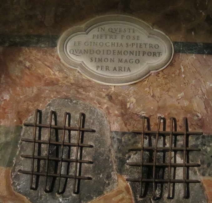“In queste pietre pose le ginocchia S. Pietro quando i demonii port. Simon Mago per aria.”