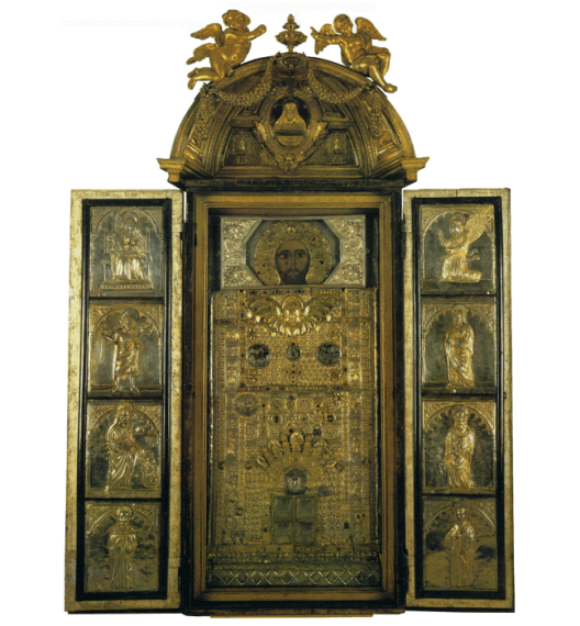 La Scala conduce al Sancta Sanctorum, così chiamato per il gran numero di reliquie che vi erano custodite. Per la loro custodia Leone III fece costruire una cassa di legno di cipresso, al centro della quale fece scrivere: SCA SCO RVM, (Sancta Sanctorum), che è sotto l’altare. La maggior parte di quelle reliquie è stata trasferita in Vaticano. Questo luogo era la cappella privata dei papi, l’oratorio di San Lorenzo in Palatio ed anche l’archivio segreto pontificio. Nell’architrave della cappella possiamo leggere l’iscrizione “Non est in toto sanctior orbe locus”3 sotto la quale, a presiedere il magnifico luogo, c’è l’immagine acheropita del Salvatore4. In questo luogo si venerano anche tre portali di marmo provenienti dal Praetorium, il palazzo di Pilato.