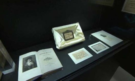 I capelli di Leonardo, con altri documenti a supporto del reperto, esposti nella mostra Leonardo Vive, nel Museo Ideale Leonardo da Vinci