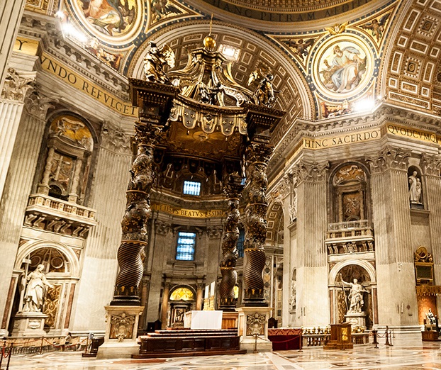 interior de la basílica de San Pedro en Vaticano. Detrás del baldaquino del altar mayor puede verse a la izquierda la capilla y el balcón de Santa Elena y a la derecha los de la Santa Lanza, identificados con la estatua de Longino de Bernini