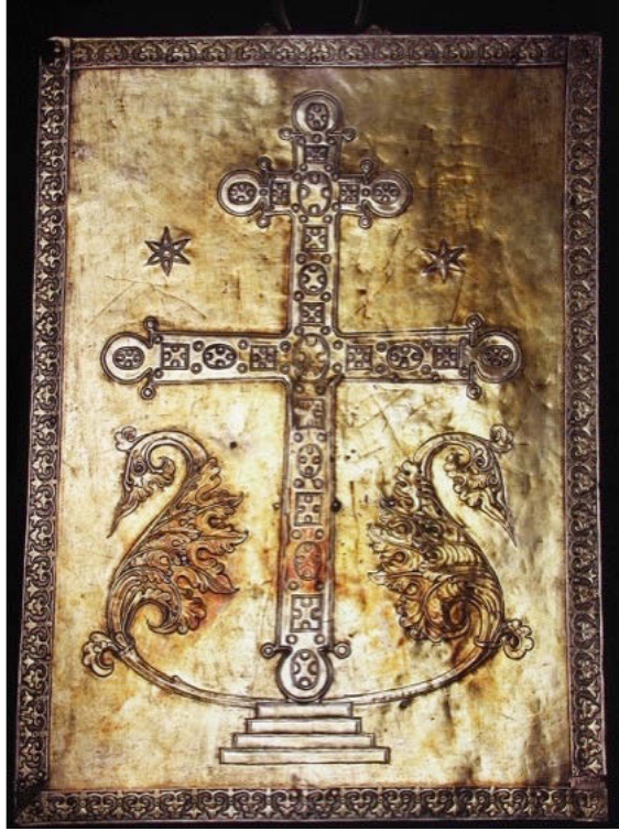 La base su cui è incassata la croce è formata da venti placchette d’argento dorato nelle quali i personaggi rappresentati sono anch’essi realizzati in smalto. Ai due lati della croce troviamo, in verticale, dieci arcangeli: cinque a destra e cinque a sinistra. Nelle restanti dieci placchette, a coppie, sono rappresentati 12 serafini e 8 cherubini. In realtà sono sportellini destinati a custodire altrettante reliquie, che in parte sono andate perdute.