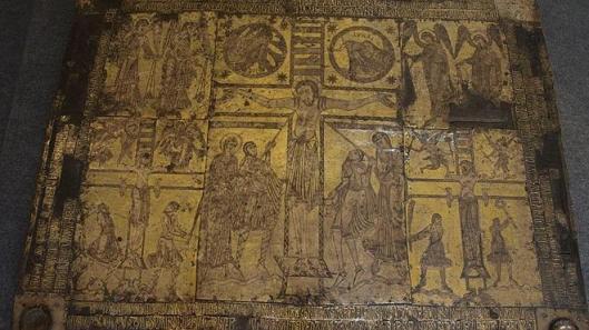 Arca Santa. Coperchio, prima del restauro. L’iscrizione in latino percorre, su quattro linee, tutto il perimetro