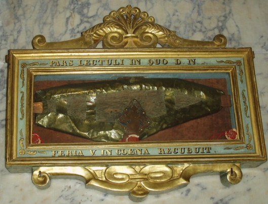 En la cercana capilla del Sancta Sanctorum, sin embargo, en la pared de la izquierda mirando al altar, puede verse una parte del banco o asiento donde se sentó Cristo en ocasión de la última Cena. El letrero que puede leerse en el marco donde está expuesta la reliquia reza: ‘Pars lectuli in quo D.N. Feria V. in Coena recubit’. La expresión ‘Feria V’ se referiría al jueves. El jueves santo. Sobre esta reliquia tampoco se sabe mucho más.