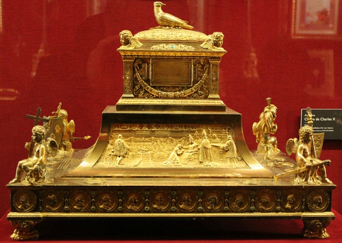 Así se llama la ampolla que contenía el aceite con el que se ungían a los reyes de Francia, en la ceremonia de su consagración, en la catedral de Reims.