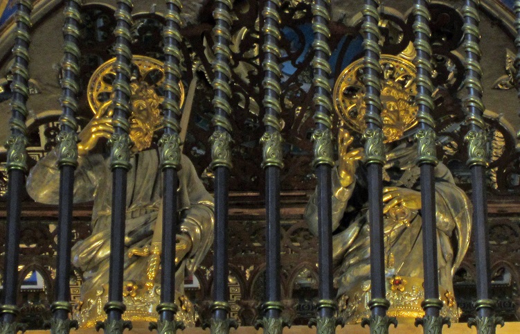 Los bustos dan la espalda al ábside y, vistos de frente, el de la derecha corresponde a San Pedro y el de la izquierda a San Pablo, perfectamente reconocibles por su atributo, las llaves para San Pedro y la espada para San Pablo. Están protegidos por la reja del ciborio.
