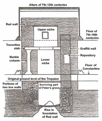 El lugar de la sepultura de San Pedro fu objeto de gran veneración ya desde el primer momento. Algunos años más tarde Anacleto, futuro papa de Roma del 76 al 89, mandó edificar en ese lugar un pequeño mausoleo. En la segunda mitad del siglo II se construyó sobre la tumba de San Pedro un ‘trofeo’5, el Trofeo de Gayo, adosado a un muro rojo, con dos nichos, siendo el inferior más grande, y rematado con una lápida de mármol apoyada sobre dos columnas.
