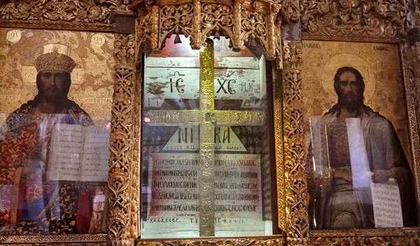 Este pedazo de cuerda de cáñamo, supuestamente manchada de sangre, está custodiada en el interior de una cruz-relicario de 1817, visible en la parte principal del iconostasio, colocada al lado de la imagen del Salvador. La cruz de madera, revestida de plata y oro, está decorada con imágenes de la vida de Cristo. En los cuatro extremos, los cuatro evangelistas. En el centro, en la intersección de los dos brazos, una puertecita dorada permite ver la ‘Agios Kanavos’ (la sagrada cuerda de cáñamo). Se trata de un hallazgo único en el mundo.
