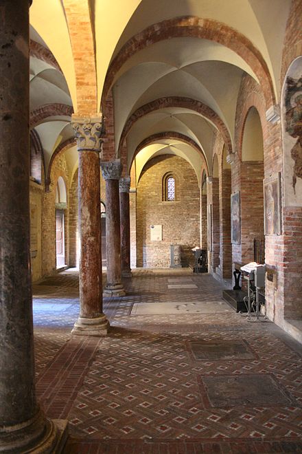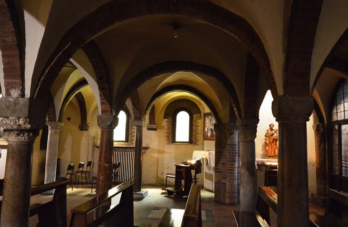 La cripta, a la que se accede bajando los escalones, se remonta a inicios del siglo XI y alberga, en dos urnas, los restos de los Santos Vital y Agrícola. Está formada por cinco naves y doce columnas (como doce eran los apóstoles) de diferentes medidas y estilos. Según la tradición, una de estas columnas, la segunda de la derecha, fue llevada desde Jerusalén por Petronio y representa, desde el zócalo hasta el capitel, la estatura de Jesús (aproximadamente 170 cm).