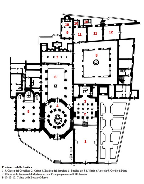 Capilla de la Venda, Jerusalén boloñesa, Patio de Pilatos, Pila de Pilatos, San Esteban, San Juan al Monte, San Petronio, San Vital y Agrícola, Sancta Jerusalem Bononiensis, Santo Sepulcro, Venda de la Virgen María