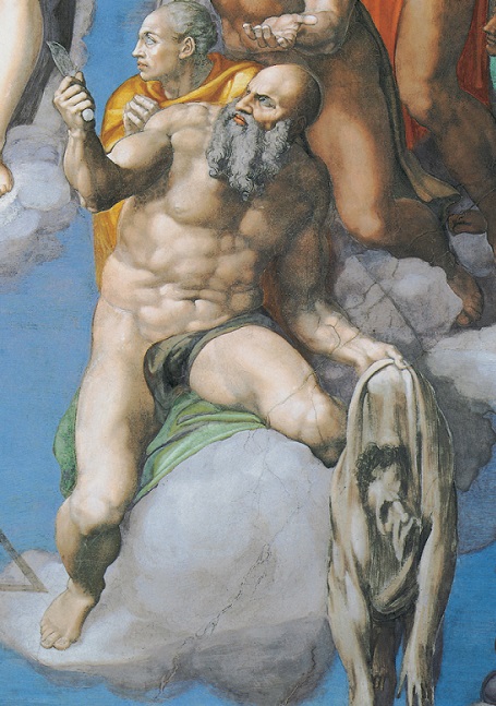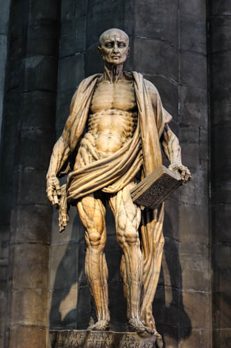 Este atributo, el cuchillo, lo encontramos en toda la iconografía, a veces acompañado también de su piel, como por ejemplo en el Juicio Universal de Miguel Ángel Buonarroti, en la Capilla Sixtina, donde en primerísimo plano vemos a San Bartolomé con el cuchillo en una mano y su piel en la otra, en la cual el autor ha pintado una suerte de autorretrato… Otra famosa, y porqué no decirlo, un poco espeluznante, representación de San Bartolomé, es la obra de Marco d’Agrate, discípulo de Miguel Ángel, que podemos admirar en el Duomo de Milán. Aquí San Bartolomé está vivo, de pie, desollado y con su piel envuelta alrededor de su cuerpo, en el cual su anatomía queda completamente al descubierto, debido a la falta de piel…