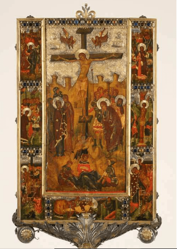 Nella parte frontale, il pannello a scorrimento, è contornato su tre lati da una cornice fissa, sulla quale sono dipinte sette scene della Passione di Cristo separate de fasce di gemme e filigrana. Nel pannello centrale mobile è rappresentata una scena dipinta della crocefissione, impreziosita nella parte superiore da una lamina d’argento dorato e da una fila di gemme.