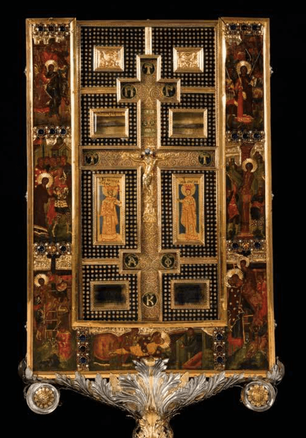 Si tratta di un magnifico reliquiario/stauroteca1 bizantino datato intorno al XIII-XIV secolo, con aggiunte del XV secolo, commissionato molto probabilmente dalla principessa bizantina Irene Paleologina, o per lo meno il crocefisso custodito all’interno, ed il resto realizzato in un secondo momento. Di fatto, il nome di questa principessa lo troviamo inciso lungo il bordo di detto crocefisso, indicando che questa principessa lo aveva fatto adornare in argento.2 Fu donato verso il 1430 dall’imperatore Giovanni VIII Paleologo (1425-1448) al suo confessore Gregorio III Mammas, futuro Patriarca di Costantinopoli (1443-50), che insieme al Cardinale Bessarione, (Patriarca di Costantinopoli dei Latini e Legato pontificio a Venezia) propugnava l’unione della Chiesa Ortodossa con la Cattolica.