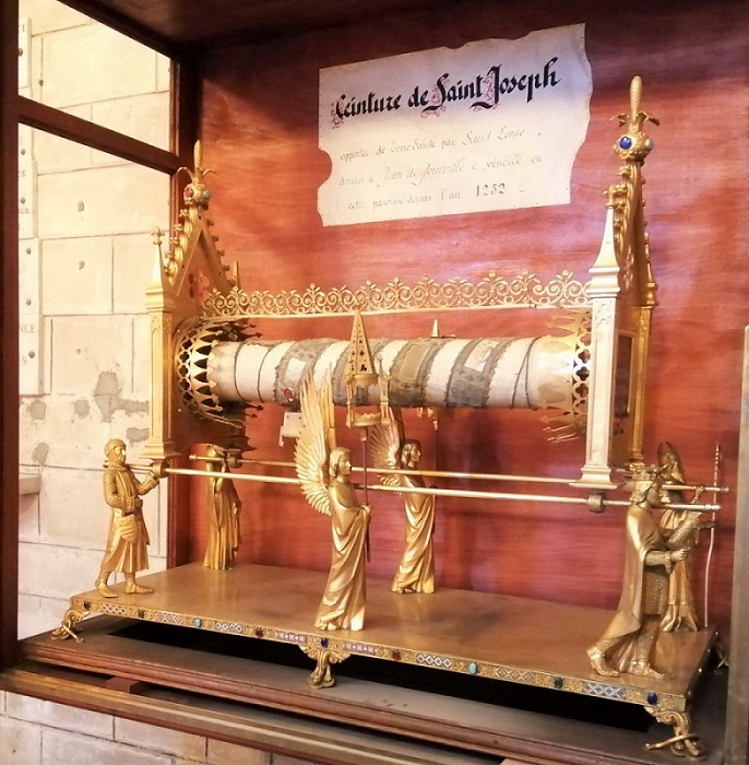 En Joinville (Haute-Marne, Francia), en la iglesia de Notre Dame, se conserva su cíngulo, o cinturón. Lo habría llevado a esta ciudad en 1248 un tal Jean de Joinville, cronista de la Séptima Cruzada y amigo del rey Luis IX (el futuro San Luis de los Franceses), a la vuelta de la misma. La entregó al capítulo de San Lorenzo y más tarde mandó construir una capilla para albergar la reliquia en la iglesia de San Lorenzo. En el transcurso de los siglos a la reliquia le fueron sustrayendo pequeñas partes para satisfacer la demanda de diferentes iglesias también situadas en Francia. El último trozo que se quitó, cortado personalmente por el obispo de Châlons en 1662, fue contra la voluntad del capítulo de San Lorenzo y de los habitantes de Joinville. A partir de ese momento estuvo terminantemente prohibido tocar la reliquia y se impidión que fuera separado ningún trozo, aunque fuera pequeñísimo, so pena de excomunión.