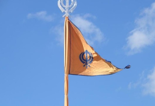 En cada templo se coloca una bandera amarilla, la Nishan Sahib, con el diseño del «Khanda».