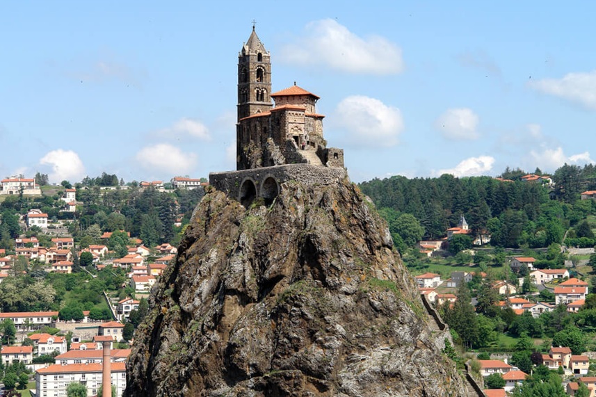 Sul secondo punto più alto, di ben 85 metri, chiamato l’Aiguilhe (l’ago) abbiamo una cappella, Saint-Michel d’Aiguilhe, risalente all’anno 969. Per raggiungerla è necessario salire 268 gradini. Dedicata all’arcangelo San Michele, è un tempio di un’estrema bellezza. L’edificio originario, una cappella rettangolare con tre cappelle semicircolari fu ampliato nell’XI secolo con l’aggiunta di un campanile e del portale, che è ornato da un arco polilobato sormontato da un mosaico di pietre policorme, di ispirazione orientale.