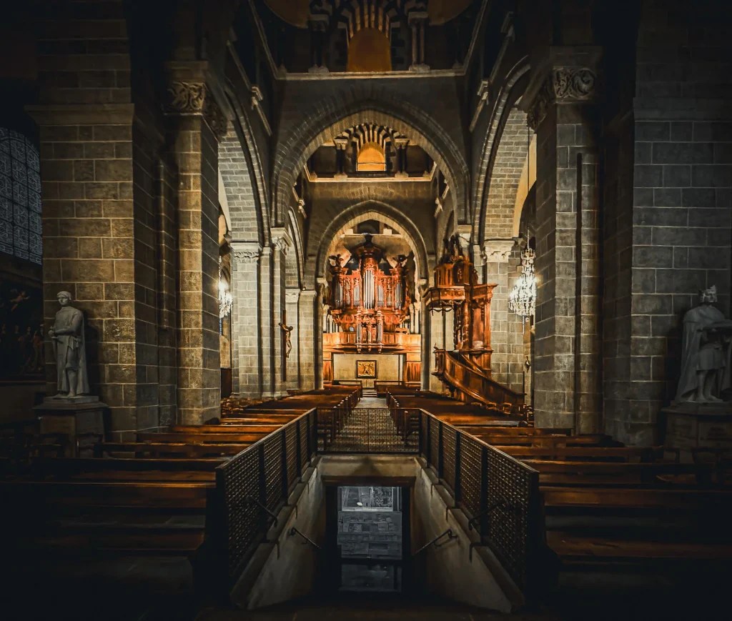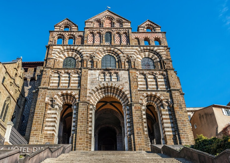 La cattedrale romanica bizantineggiante di Notre-Dame sorge sulla terza elevazione, sulla cima del Monte Anis, cosí chiamato perché era dedicato al culto della dea Anas, non solo è l’edificio più importante, ma è molto, molto particolare. Risale all’XI secolo, costruita su una primitiva chiesa del V secolo, e fu ampliata nel XIII. A causa di questa ultima ristrtturazione, per raggiungerla bisogna salire ben 134 gradini. Alla fine della scala non ci troveremo davanti al portale ma ‘sbucheremo’ in una sorta di nartece sotterraneo, sotto la grande navata. Poi un’altra scala di 102 gradini ci porterá alla porta Dorata. Dietro a questa, diciassette scalini conducono al centro della navata. Si finisce tra i due pilastri di fronte ai quali sono state poste le statue di San Luigi e di Giovanna d’Arco, proprio di fronte all’altar maggiore.