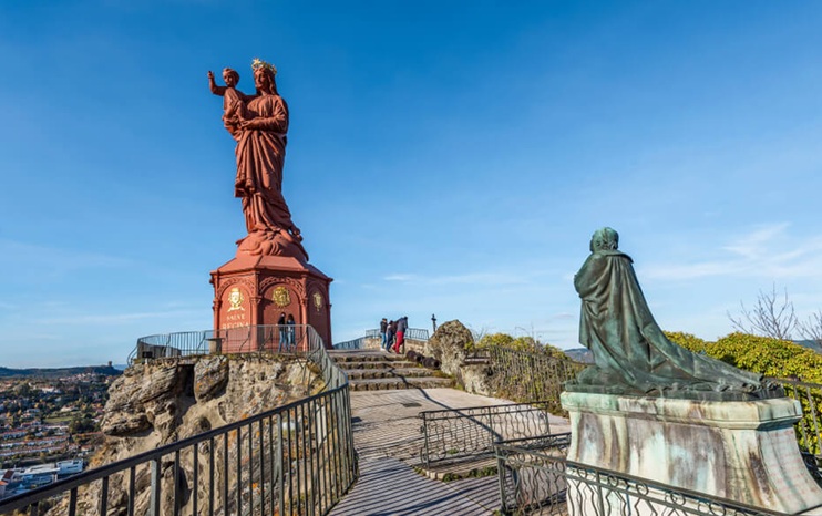 Sul piú alto di questi tre punti, la roccia Corneille, di 132 m di altezza, spicca la giganesca statua della Vergina Maria coronata di stelle, con il bambino, alta ben 22,70 metri3, con 835 tonnate di peso. E’ stata scolpita da Jean-Marie Bonnassieux nel 1860. È in ferro ed è stata realizzata con 213 cannoni sequestrati ai russi nella battaglia di Sebastopoli, durante la guerra di Crimea. Una scala a chiocciola nel suo interno permette di salire fino alla corona della Vergine da dove si può godere di una vista panoramica della città.