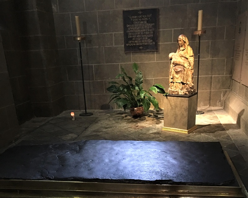 La pietra ha continuato a essere venerata e i malati, in particolare chi soffriva di febbre, si sdraiavano o addirittura dormivano su di essa, o accanto, nella speranza di una guarigione. Folle di persone riempivano l’intera navata. Nell’XI secolo quando una nuova chiesa fu eretta sul primitivo tempio, la pietra fu collocata sul pavimento della navata meridionale, dove è rimasta per 800 anni. Ci furono diverse altre ubicazioni all’interno della cattedrale. Oggi la pietra, una lastra di 3 m x 2, si trova incorporata nel pavimento, di fronte alla porta Dorata dell’entrata principale, nella cappella del Crocifisso, a pochi metri dalla Madonna Nera. Ancora oggi, pellegrini e gente di ogni tipo praticano questo rito, per riceverne dei benefici o anche per curiosità.