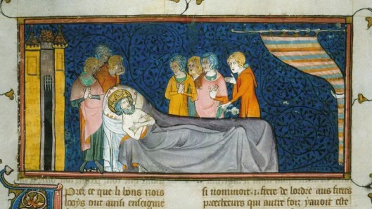 – San Luis en su lecho de muerte. Les Chroniques de France ou de Saint-Denis, entre 1332 y 1350. Mahiet, Maître du Missel de Cambrai – Royal 16 G VI – f. 444v. British Library