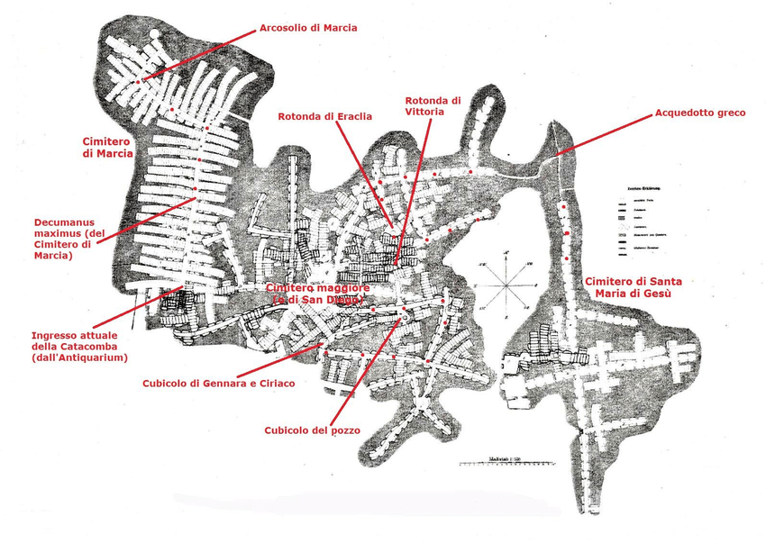 Nel sottosuolo di Roma esistono una sessantina di catacombe, delle quali la grandissima maggioranza cristiane. Nientedimeno che 150 – 170 km di gallerie distribuite su piú livelli, fino a 4 o 5 in alcuni casi. Il periodo di utilizzo fu dal II al V secolo.