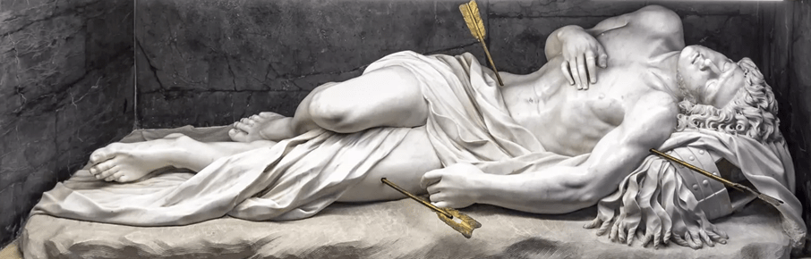 Questo luogo, che era un avvallamento per estrarre pozzolana, ha dato origine al nome di ‘catacombe’2, che prima si chiamavano cimiteri. Inoltre, queste catacombe sono legate alla memoria dei santi Pietro e Paolo3, ricordati soprattutto dai circa seicento graffiti, risalenti alla seconda metà del III secolo, con invocazioni ai due apostoli e con ripetute memorie di refrigeria svolti in loro onore. Il nome viene dalla basilica, eretta sul cimitero, e ricorda il martirio di San Sebastiano. Il sepolcro del santo venne posizionato al centro di una grande cripta e diventò presto oggetto di venerazione. Le sue spoglie, dopo vari spostamenti, sono in una cappella della basilica, sotto l’altare a lui intitolato, dove possiamo anche ammirare la statua del suo corpo giacente realizzata nel 1671 da Giuseppe Giorgetti, uno dei migliori alunni di Bernini.