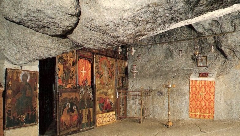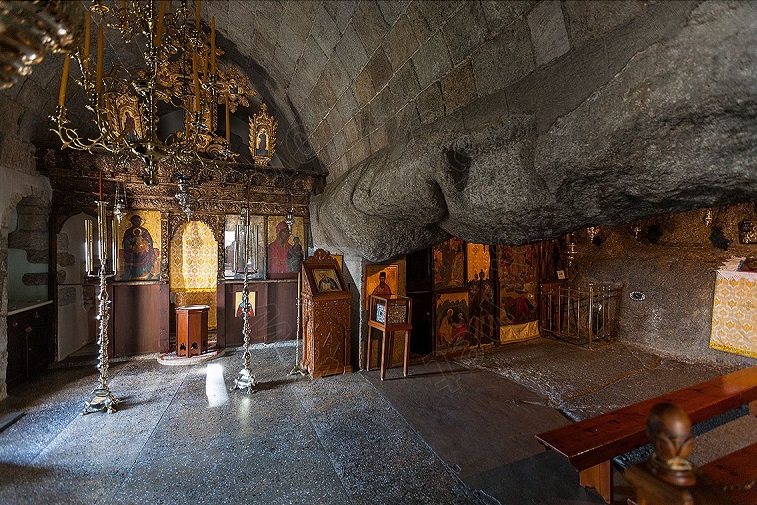 En cuanto se entra en la gruta se ve al fondo un iconostasio con diferentes iconos, entre los cuales la de la revelación del Apocalipsis, la de San Cristodulo, de la Virgen con los apóstoles y la de San Juan con su discípulo Procoro en el acto de escribir. A la derecha una reja protege el lugar donde, según la tradición, el apóstol descansaba. Una aureola de plata evidencia el lugar donde Juan apoyaba la cabeza y la pequeña cavidad con el marco de plata sería donde él ponía la mano para levantarse. Un saliente en la pared rocosa, a modo de un atril, donde en la actualidad está situado un Evangelio, sería el lugar donde el discípulo escribió el Apocalipsis.