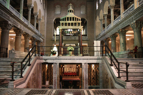 Pero para los devotos de San Lorenzo y también para los curiosos, lo importante es saber que gran parte de sus los restos se encuentran en la cripta bajo el altar mayor5,6 de la basílica de San Lorenzo extramuros, cuya visita aconsejo encarecidamente a todos los amantes del arte y de la belleza, creyentes o no, porque a pesar de las diferentes restauraciones, continúa siendo una de las iglesias más bonitas y fascinantes de Roma.