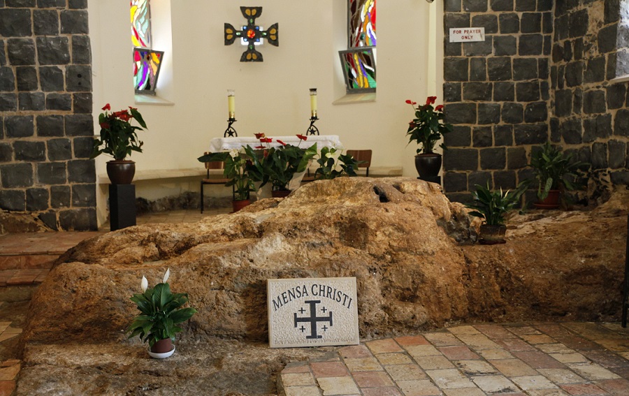 Pero ésta no es la única ‘Mensa Christi’. De hecho, en Tabgha, a orillas del lago Tiberíades, a 3 Km de Cafarnaúm, encontramos otra, en la Iglesia del Primado de Pedro. Esta pequeña iglesia custodia una gran roca que sería, según la tradición, el lugar donde los discípulos comieron con Jesús después de su resurrección, siendo ésta la tercera vez que Jesús se manifestaba a los discípulos tras su muerte. La iglesia fue construida por los franciscanos en 1993. También esta roca es llamada la ‘Mensa Christi’, como reza un letrero apoyado sobre la misma. Pero este lugar es más recordado porque aquí fue donde Jesús propició la segunda pesca milagrosa y otorgó el Primado a Pedro confirmándolo como cabeza de la Iglesia, con la expresión «Apacienta mis corderos» «Pastorea mis ovejas», como se describe en el evangelio de Juan (Jn 21, 1-23), aunque ésta no era la primera vez que dio el encargo al apóstol, que por este motivo cambió su nombre de Simón a Pedro2.