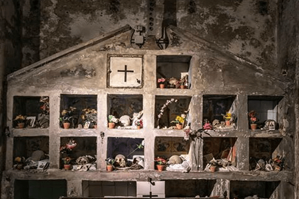 Cuando descendemos al hipogeo —a este pequeño Purgatorio— vemos a lo largo de las paredes nichos, pequeños altares y vitrinas dedicadas a estas ánimas pezzentelle. Cada cráneo tiene su nombre y su historia, nacidos de la imaginación de quien lo cuida. Entre todos, el más famoso es el cráneo de Lucía, con una preciosa corona y un velo de novia.
